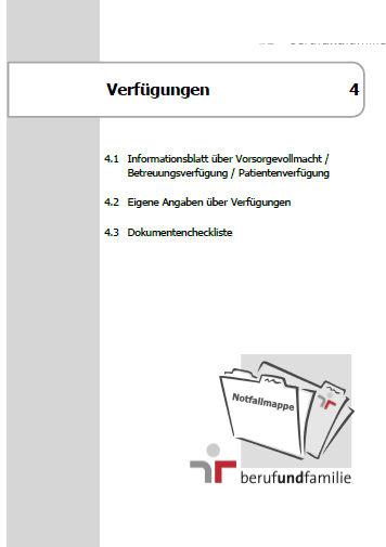 Unter der E-Mail-Adresse kundenbetreuung@berufundfamilie.de können Arbeitgeber bei uns die Notfallmappe „Ich bin vorbereitet“ für ihre Beschäftigten anfordern. Die Notfallmappe beinhaltet klare Handlungsanweisungen und Formulare für den Pflegenotfall. Auch Privatpersonen bieten wir die Notfallmappe an. Der Versand erfolgt als PDF-Datei per E-Mail.